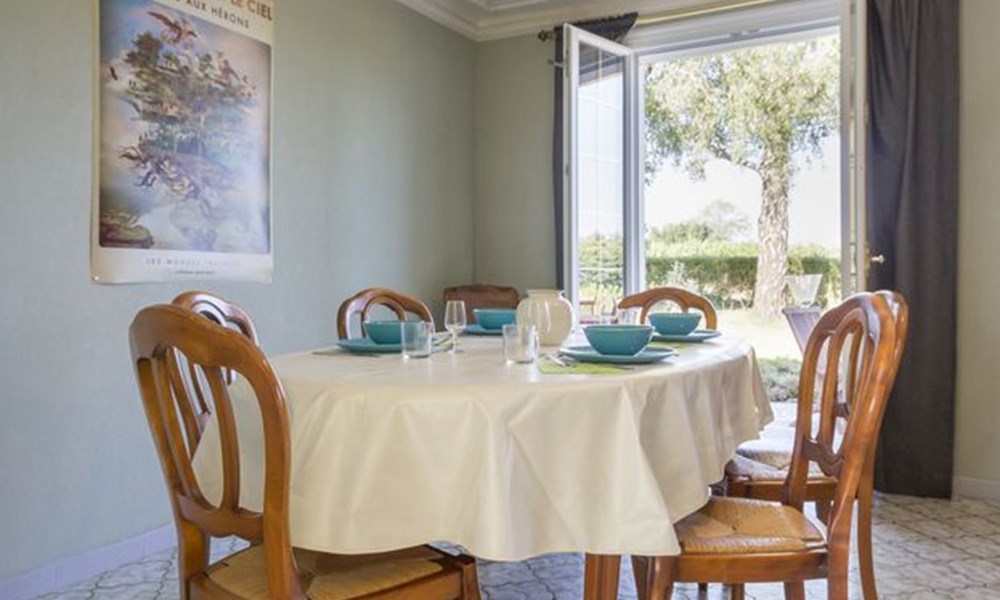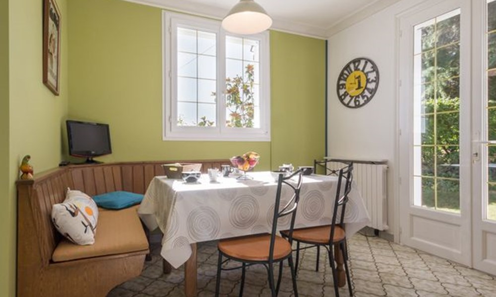 La cuisine est ouverte sur un coin repas avec table et banquette, (les enfants l'adorent !) petit écran plat TV, porte fenêtre avec accès à l'extérieur. Ce coin repas communique également sur la salle à manger très spacieuse avec espace salon, TV écran plat, canapé d'angle.