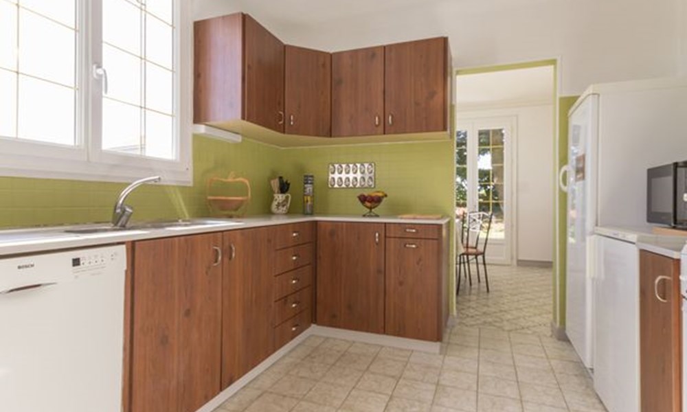 Une large entrée dessert une cuisine toute équipée (lave vaisselle, grand réfrigérateur, congélateur,four micro ondes, four électrique et plaques au gaz) et une lingerie (lave linge et sèche linge, évier, chaufferie) donnant sur l'escalier qui accède à l'étage.