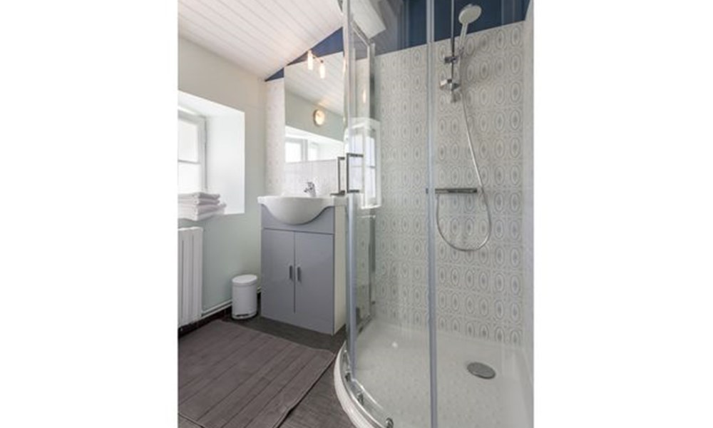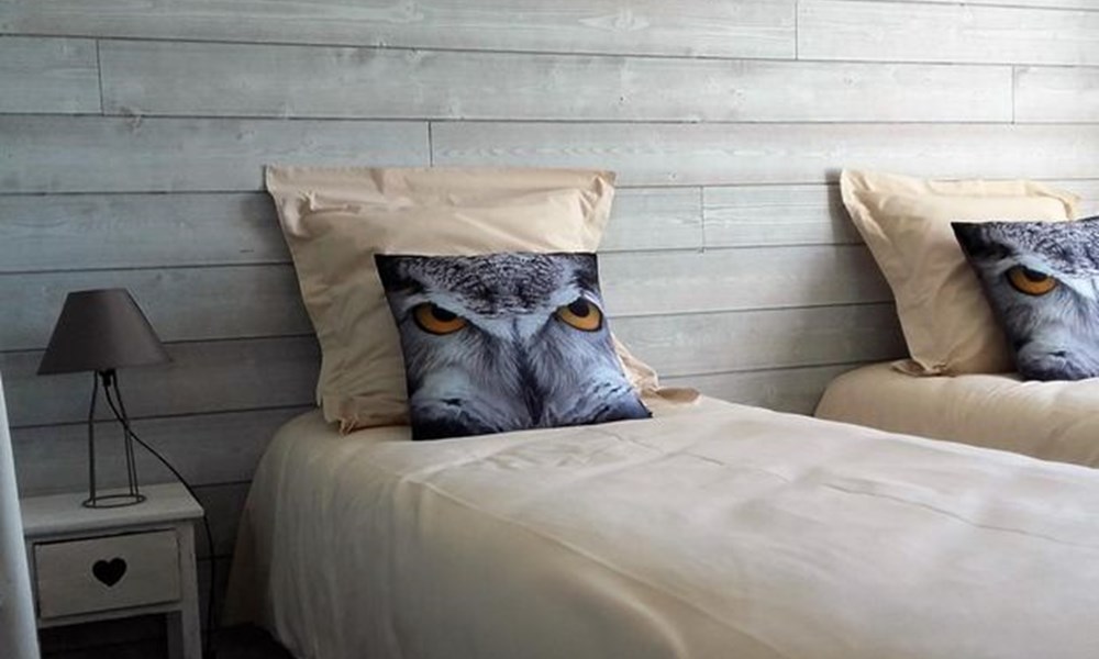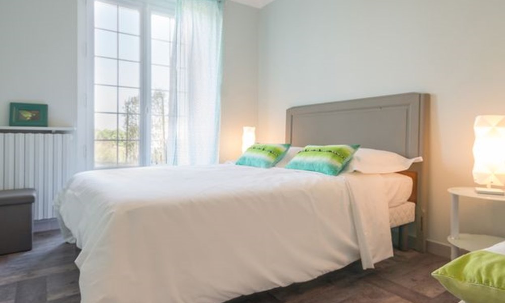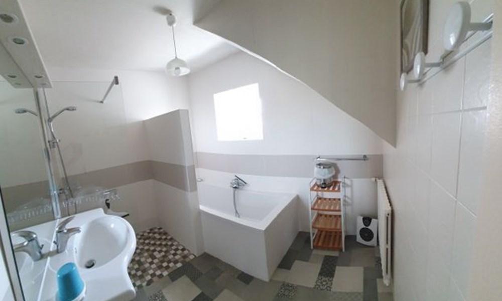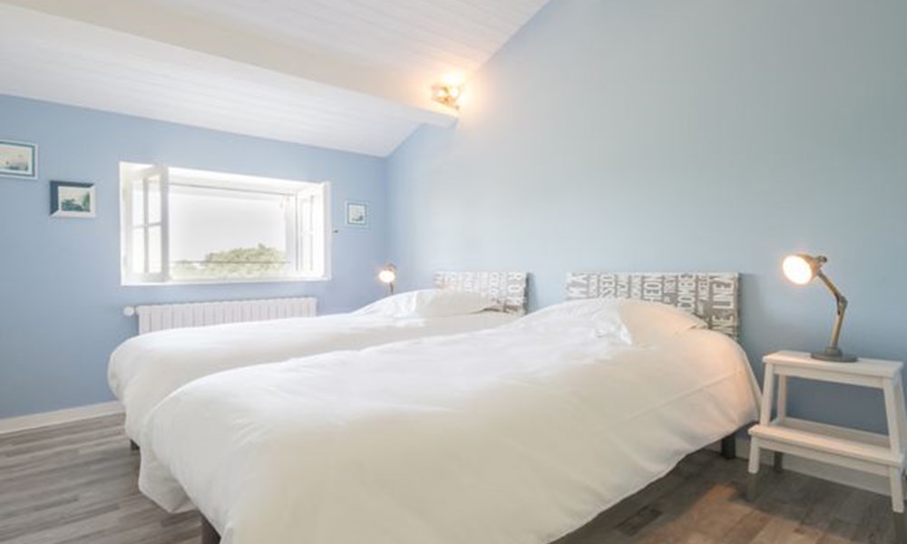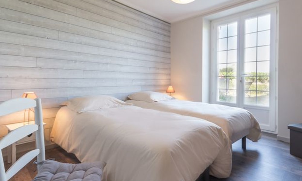 Le couloir du rez de chaussée dessert deux chambres, une chambre à deux lits 80x190 (pouvant être rapprochés), une chambre à un lit double en 140x190, (équipées de porte fenêtre), une salle de bain spacieuse et toilettes séparées.